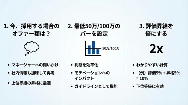 評価に基づく昇給ではなく、昇格に基づく昇給の場合、その金額決定に悩むことが多いと思います。 実践の場で経験してきた3つの方法を、簡潔に紹介します。 ① もし、今、採用する場合のオファー額は? この問いをマネージャー( […]